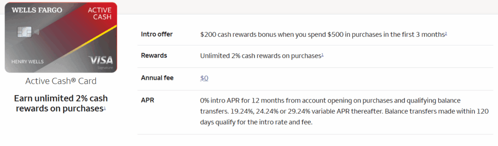 Wells Fargo Active Cash® Card If simple rewards are your thing, the Wells Fargo Active Cash® Card is a great choice. It offers an unlimited 2% cash back on every purchase you make. No rotating categories to keep track of, no hoops to jump through – just a solid 2% back on everything. This makes it a great card for all your general spending.